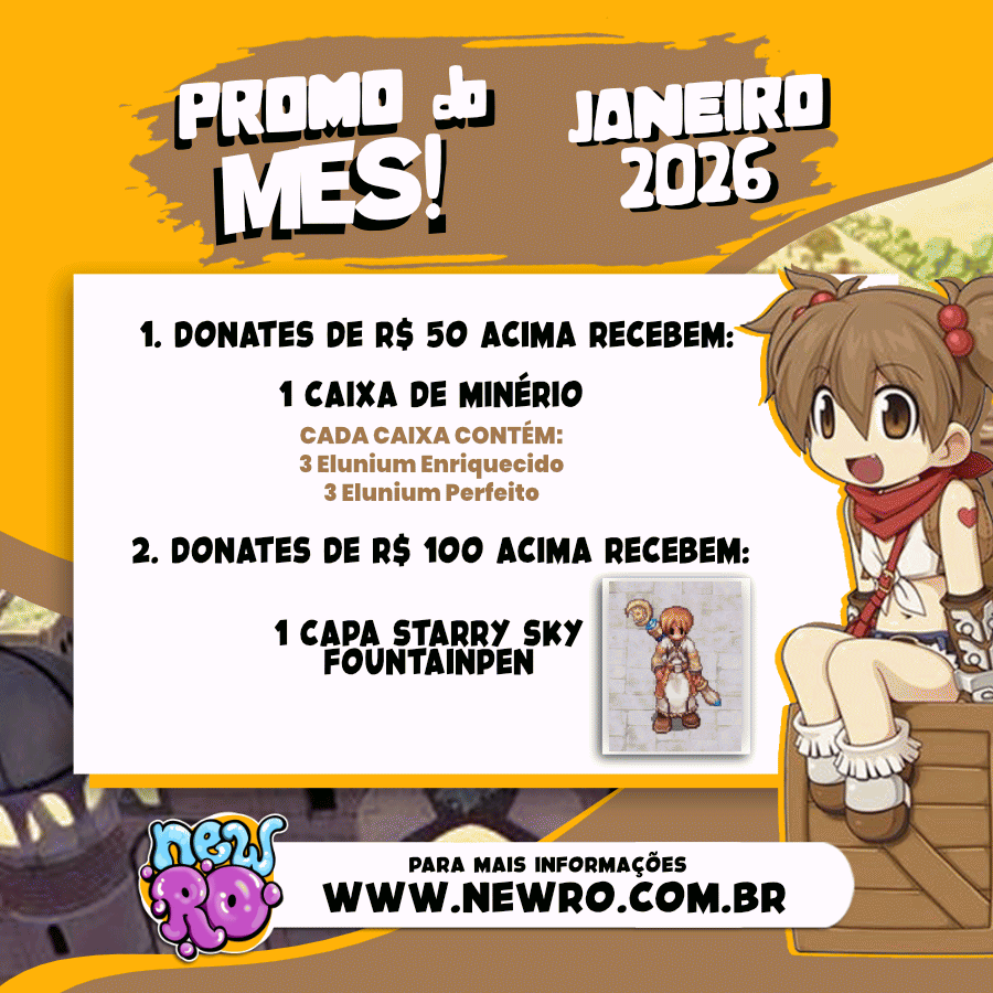 🎁 Caixa de Minérios A cada R$ 50 em donate, você receberá 1 Caixa de Minérios contendo 3 Elunium Enriquecido e 3 Elunium Perfeito.